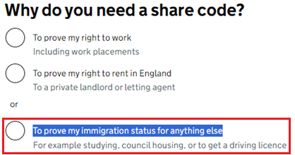You can get an Immigration Status Share Code from the gov.uk website. Please note that this is a separate Share Code to your Right to Work Share Code as the Disclosure and Barring Service need different information to what is provided on a Right to Work check. - You will need to choose the 'To prove my immigration status for anything else' option after supplying your personal details.